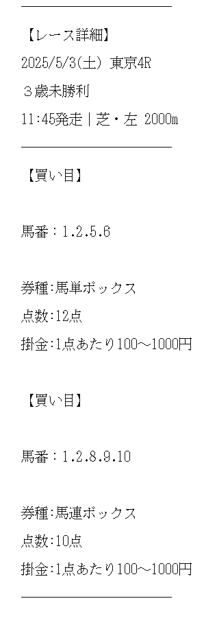 土日2日間で4鞍提供で情報料金10万円